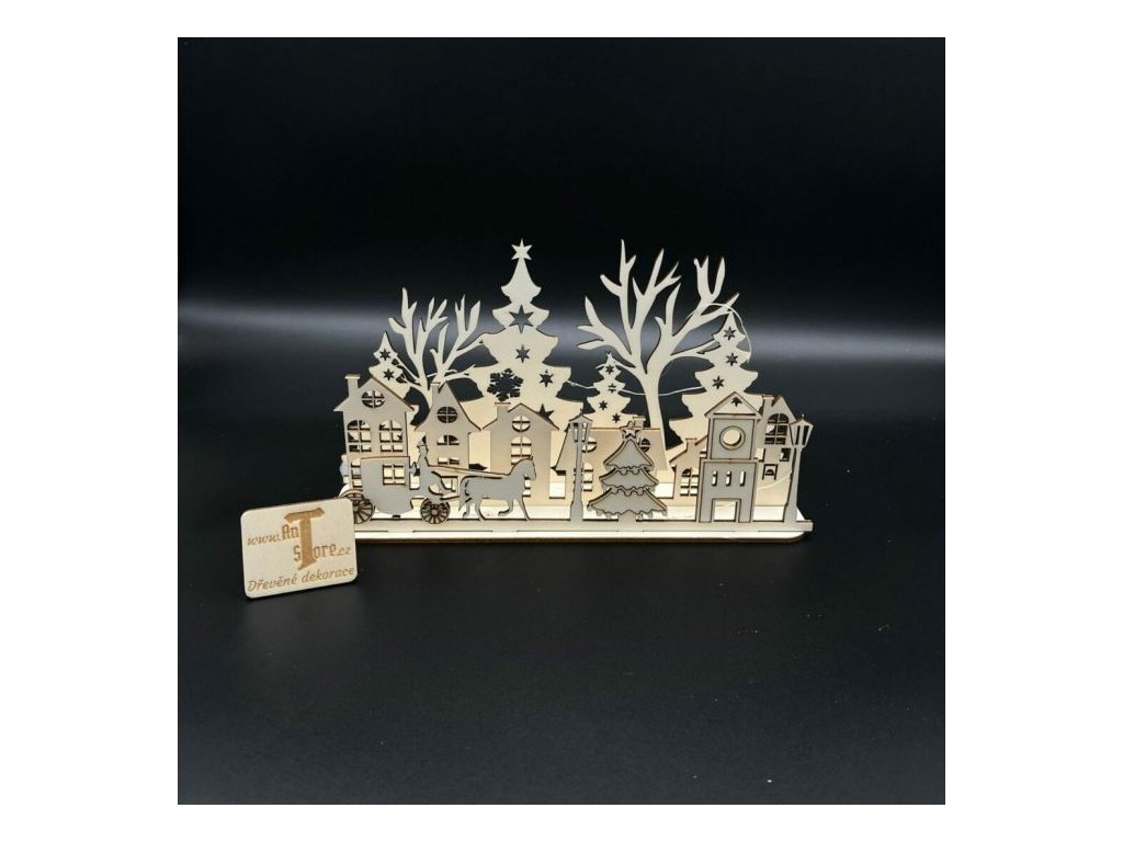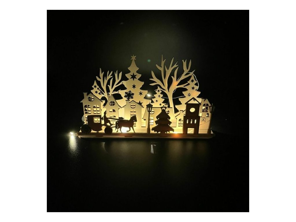 Sestavená ze tří vrstev dřevěných siluet, které dohromady tvoří malebný obraz zimní vesnice, je ideálním doplňkem pro vánoční období.